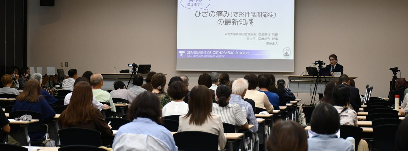 医学部医学科の佐藤正人教授(外科学系整形外科学領域)が10月5日に東京都中央区のベルサール八重洲、19日に大阪市北区のミーティングスペースAP大阪駅前で開催された市民公開講座「ひざの痛み相談室 変形性膝関節症とは? ~原因から最新治療、未来の医療まで~」(主催:日本再生医療学会、共催:日本整形外科学会)の講師を務めました※。5日はオンライン併用で行われ、患者や家族、医療従事者ら多数が参加しました。