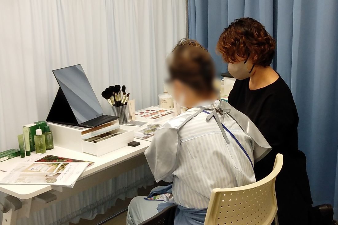 期間中は、乳腺外科の外来病棟にウィッグと補正下着の展示ブースを設置。会場では、企業の担当者から種類や選び方、手入れ方法について説明を受けた参加者が、重さや感触を確かめたり、試着したりする姿が見られました。また、デリケートになった肌のケアや、顔色を明るく生き生きと見せるメイク、爪の手入れ、ネイルチップ(つけ爪)、ハンドマッサージをマンツーマンで体験できるコーナーを設けたほか、院内の別会場で、手術の傷跡を目立たなくするメイクの実演も行いました。