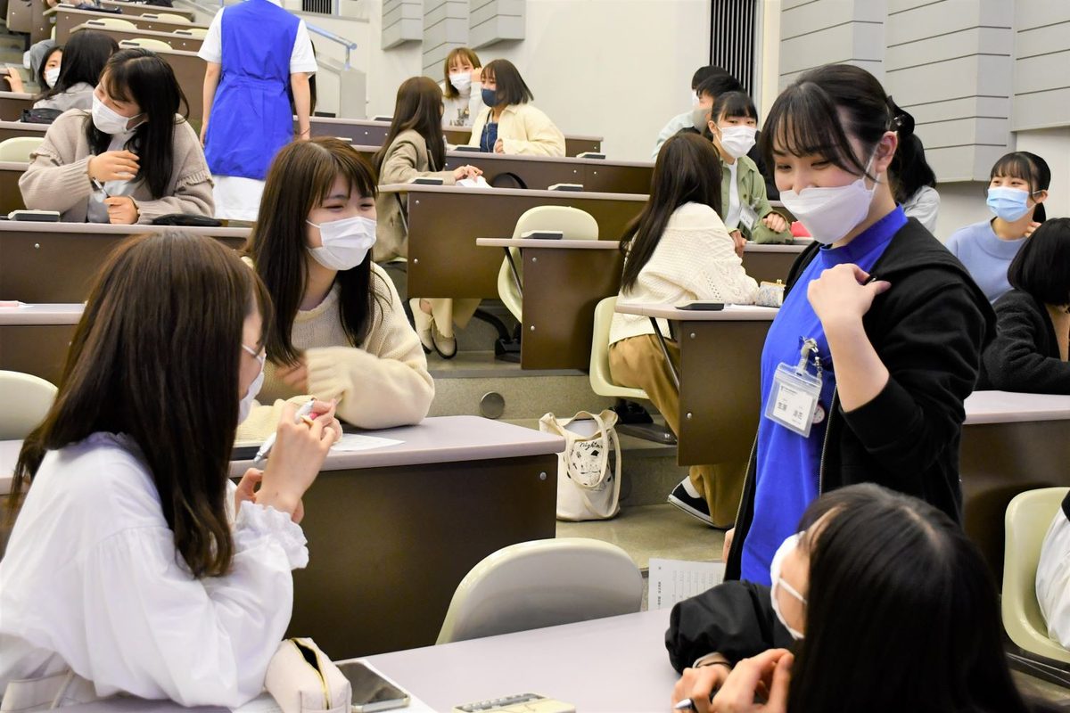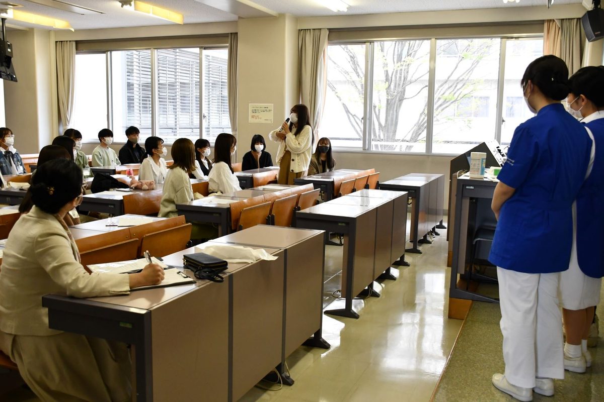 医学部看護学科では4月6日に伊勢原キャンパスで、新入生研修会を実施しました。新入生が早期に本学のシステムや学生生活に慣れて学びの方向性を見出せるよう、教職員と学生会に所属する本学科の3、4年次生が企画したものです。午前には、新型コロナウイルス感染症の拡大により昨年度に実施できなかった2年次生を、午後は1年次生を対象に開催。どちらも手指消毒やマスクの着用、密集を避けるといった感染対策を徹底しました。