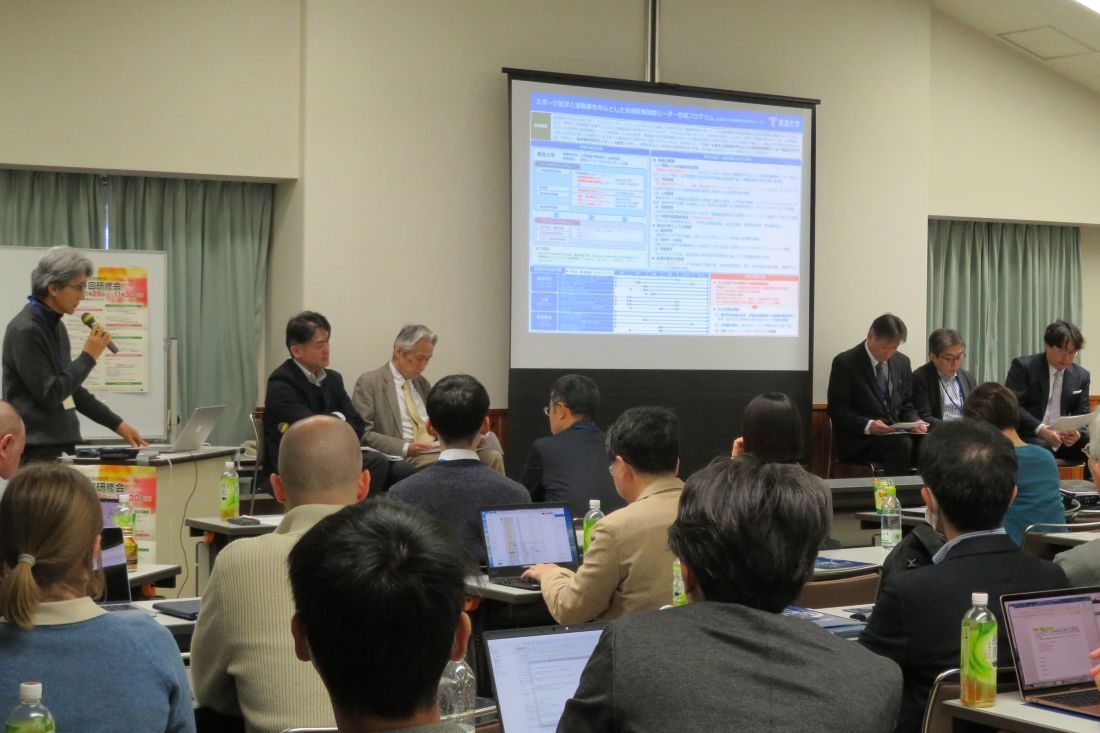 2日目には、第3部の研究紹介2件に続き、第4部として「スポーツ医学と運動器を中心とした先端医療国際リーダー育成プログラム」に関する座談会を実施。大学院医学研究科の穂積勝人研究科長が司会を務め、秦野伸二副学長(研究担当、医学部医学科教授)やスポーツ医科学研究所の山田洋所長(体育学部体育学科教授)、本研究所の稲垣所長、佐藤正人次長(医学科整形外科学領域教授)、酒井大輔教授(同)らが、本プログラムの構想や体制、現在の取り組み、今後の展望について語りました。最後に佐藤次長があいさつに立ち、「この研修会が、研究のさらなる進展や新たな共同研究につながるよう期待しています」と結びました。