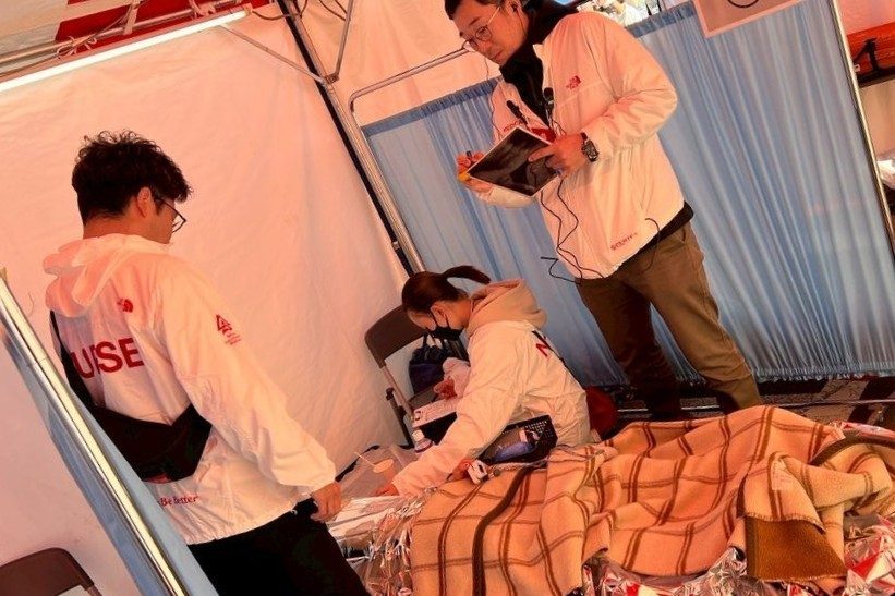 看護学科4年次生の落合勇斗さんは、けいれん発作を起こしたランナーに対し、医師、看護師の指示の下で救急車の手配などをサポート。「一次救命処置のプロバイダー資格を取得し、スタッフ講習会に参加するなどの準備をしてきましたが、倒れた人を前にしてどう動けばよいか分からず、もどかしい気持ちでした。医療従事者のてきぱきとした対応を目の当たりにし、もっと勉強しなければと気持ちを新たにしました。この経験を糧に、看護の知識と技術、現場対応力をしっかりと身につけたい」と意欲を話していました。