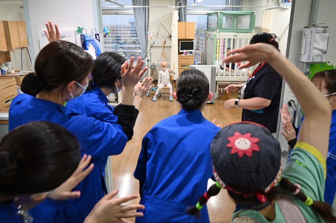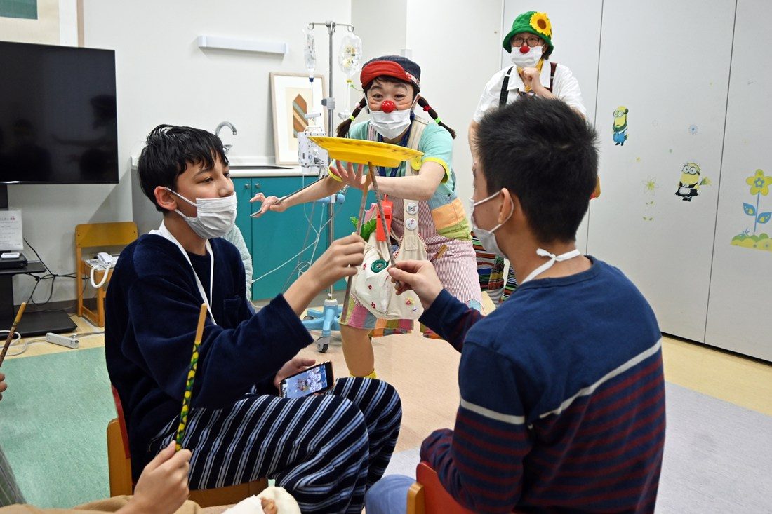 当日は、認定NPO法人日本クリニクラウン協会から派遣された2名のクリニクラウンと、小児看護に関心を持つ有志学生5名らが、赤い鼻をつけて各病棟を巡回。新生児から中学生までの子どもたち合計約30名と交流し、皿回しやジェスチャークイズ、音のなるおもちゃなど、子どもの年齢に合わせたレクリエーションを通して笑顔を届けました。子どもたちからは、「クリニクラウンの人たちがとても明るくて元気をもらえました。また遊びに来てほしい」「入院初日だったので交流に参加するか悩んでいたけど、一緒に皿回しをした子と友達になれました。参加してよかった」といった感想が聞かれました。同病棟の日下部修也看護師は、「治療の影響で日ごろは自分らしさを出せない子どももいるのですが、自然な笑顔がたくさん見られてうれしかった。子どもたちの笑顔は業務へのモチベーションにもつながります」と話していました。