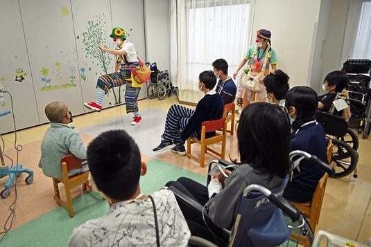 伊勢原キャンパスの医学部付属病院小児病棟で2月7日に、入院中の子どもたちに笑顔を届ける臨床道化師「クリニクラウン」の訪問を受けました。子どもたちに楽しい時間を提供したいと、小児・家族看護などを専門とする医学部看護学科の井上玲子教授が中心になって企画し実現したものです。