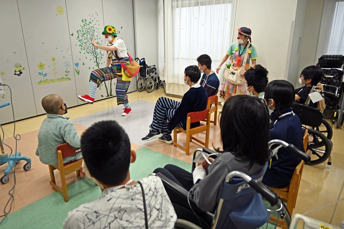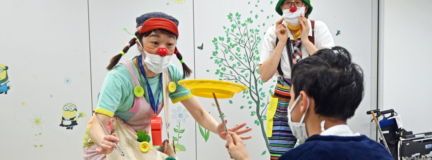 伊勢原キャンパスの医学部付属病院小児病棟で2月7日に、入院中の子どもたちに笑顔を届ける臨床道化師「クリニクラウン」の訪問を受けました。子どもたちに楽しい時間を提供したいと、小児・家族看護などを専門とする医学部看護学科の井上玲子教授が中心になって企画し実現したものです。