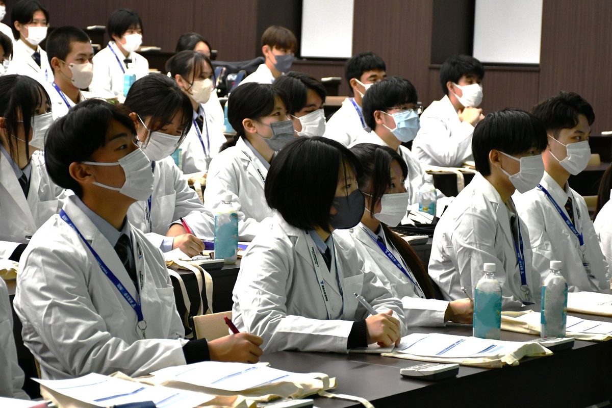 前半は松前記念講堂で、救命救急科の青木弘道医長(医学科講師)と集中治療室の尾崎美穂看護師長が、それぞれの仕事や魅力、医師・看護師を志した理由を紹介。青木医師は、臨床・研究・教育という医師の3つの役割や、院内外における救命救急活動、災害医療への対応などについて説明し、「医療は多職種の連携・協力によって成り立っています。いつか皆さんと共に働ける日を楽しみにしています」と語りかけました。尾崎師長は、看護師の幅広い活躍の場を紹介し、「患者さんの“治る力”を支えるだけでなく、その人らしい最期をサポートするのも大切な役割です。看護師は、人の生涯の大切な局面に触れられるやりがいのある仕事です」と話しました。生徒たちはメモを取りながら熱心に耳を傾け、「医師のやりがいについて具体的なエピソードを聞けてよかった」「患者さんの一番近くにいて思いを受け止めるのが看護師の仕事だと知り、看護師になりたいという気持ちが強くなりました」と感想を話していました。