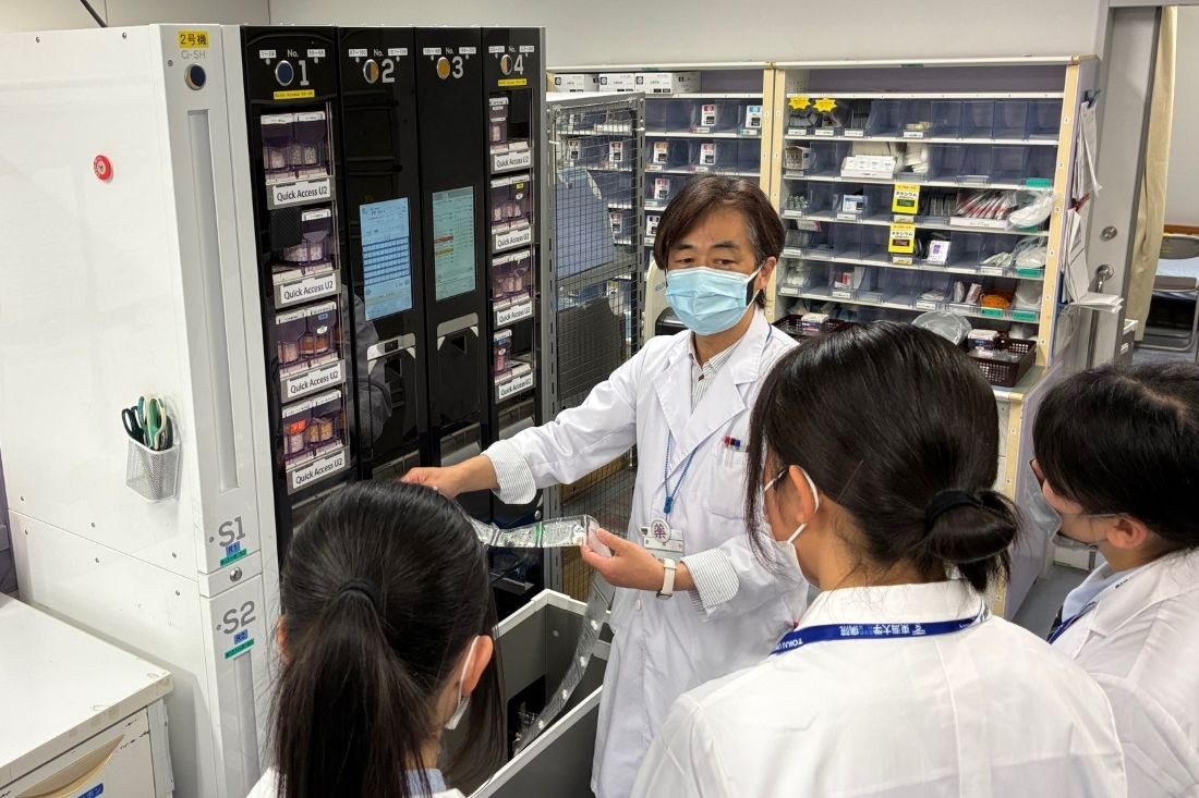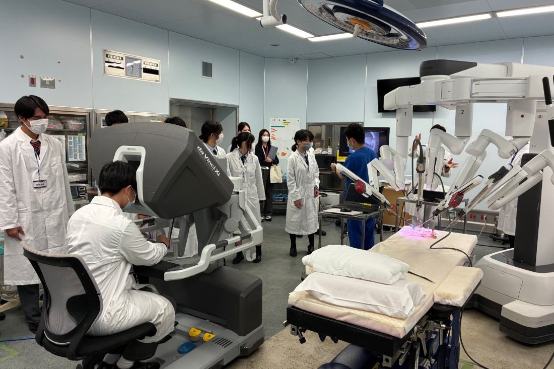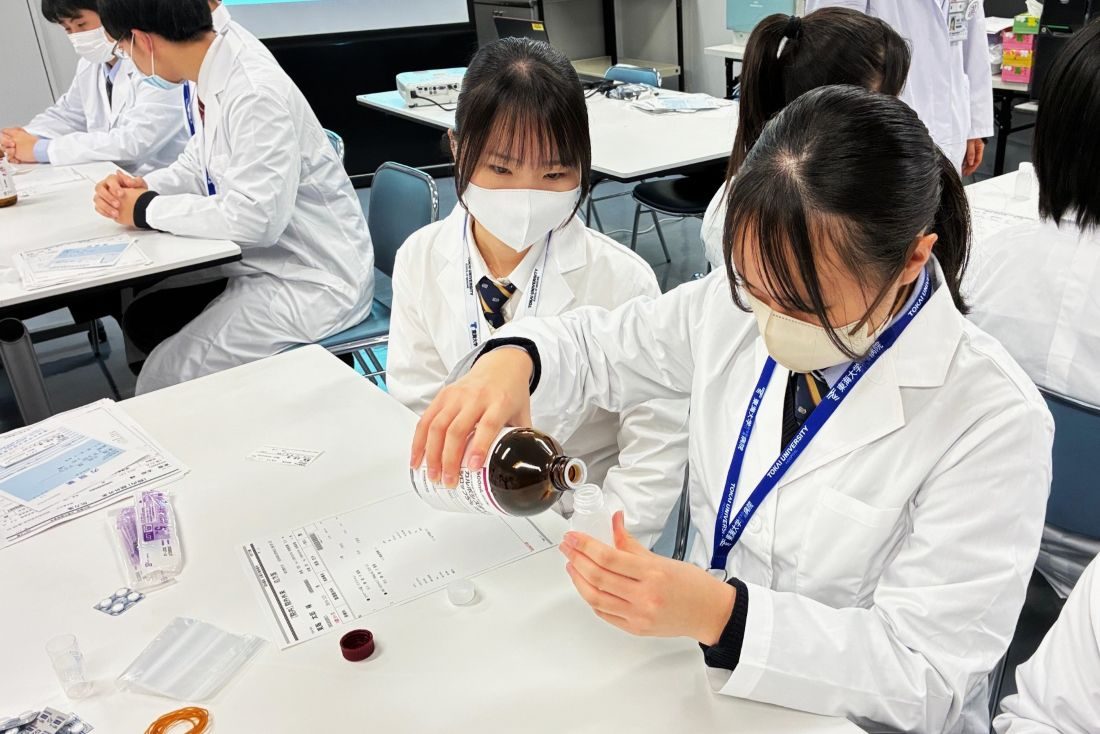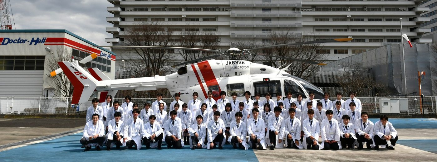 後半は、尿や血液、心電図などの多様な検査業務を担う臨床検査技師と、人工心肺装置や血液浄化装置といった医療機器の保守管理・操作を担当する臨床工学技士、医薬品の調剤・提供を行う薬剤師が、医学部付属病院の各部署で業務を紹介しました。生徒たちは、血液型検査や手術支援ロボット「ダヴィンチ」の操作、医師の処方箋に基づく調剤と患者への説明を体験し、最後にドクターヘリを見学。「血液型検査が興味深く、臨床検査技師の仕事をもっと知りたいと思いました」「医学と工学を学び、臨床工学技士になれるよう頑張りたい」「患者さんに安全に薬を届けるため、薬剤師がさまざまな工夫や努力をされているのが印象に残りました」と目を輝かせていました。
