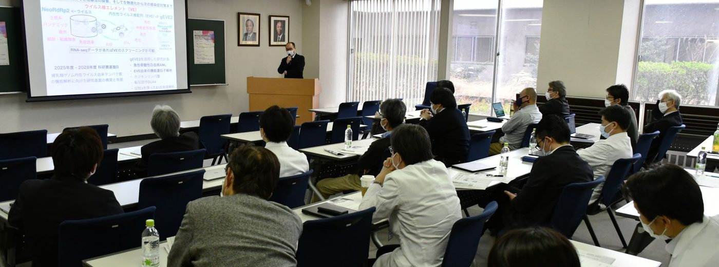 研究報告では中川草准教授が、本研究所の旗印となる成果を目指す「コアプロジェクト1」として展開している「ウイルス様エレメント(VE)研究基盤の創設と発展」について発表。VE(ウイルスに由来すると考えられる塩基配列)に関するデータベースの開発や、その解析によるVEと疾患との関連の探索といった、これまで得られた多様な成果に加え、医学部生や国内外の研究者と進めている共同研究の進捗状況を説明しました。また、次代を担う若手研究者の育成を目的とする「特別研究所員制度」で採用された研究者ら3名が、研究の意義やこれまでの成果、発展の可能性をアピール。各発表について活発な意見交換を行いました。