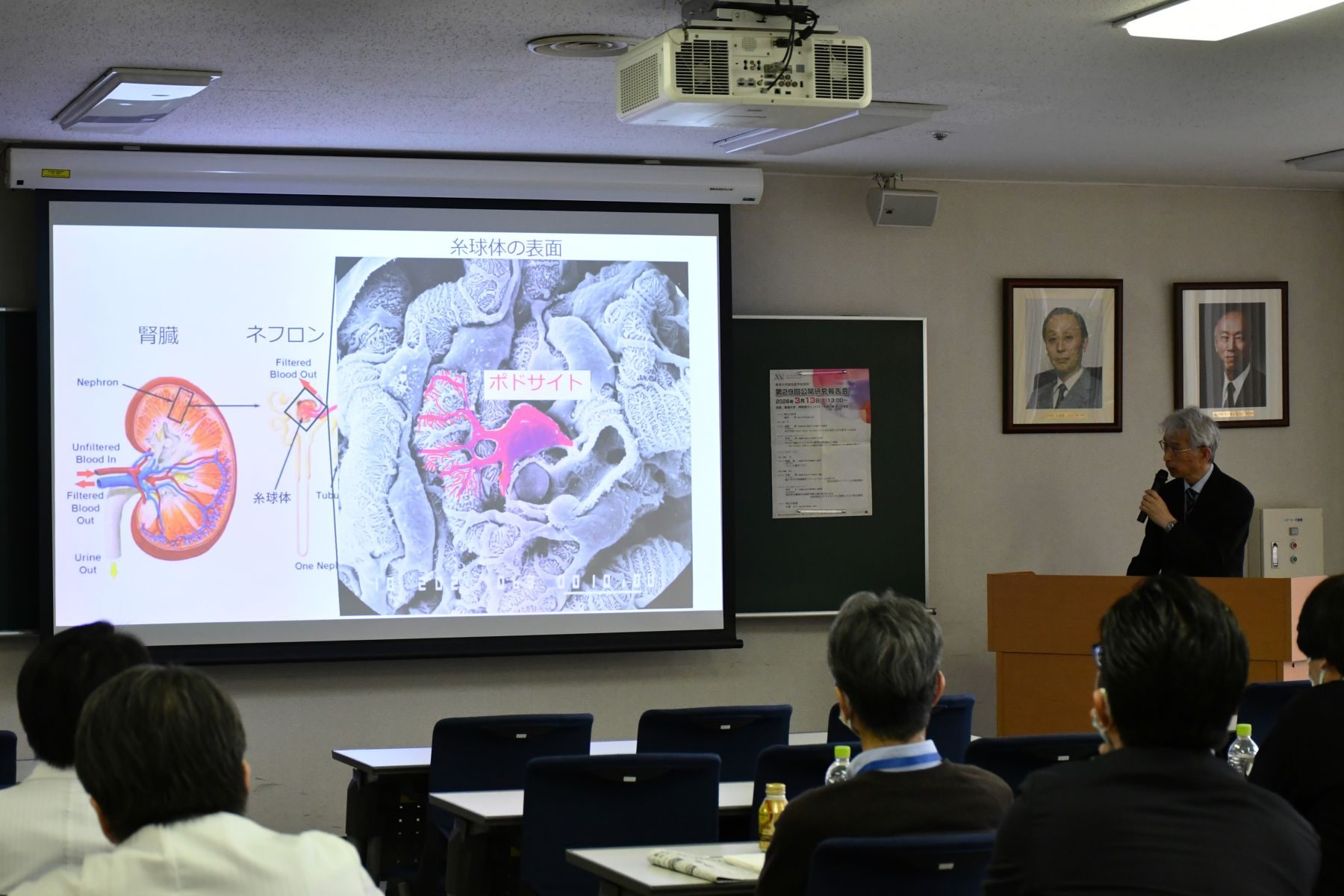 「たこ足細胞に魅せられた27年」と題して講演した松阪教授は、腎臓の糸球体上皮細胞(たこ足細胞)の傷害による腎不全の発症機序の解明や治療法開発への道筋を見いだすための研究成果について解説。MNTCとの共同研究や本研究所の宿泊研修会でのエピソードを紹介し、「腎臓病の有効な治療法・予防法の開発は喫緊の課題であり、新しいアイデアを持ってこの分野の研究を発展させてほしいと願っています。親しくしてくださった多くの先生方に感謝します」と結びました。