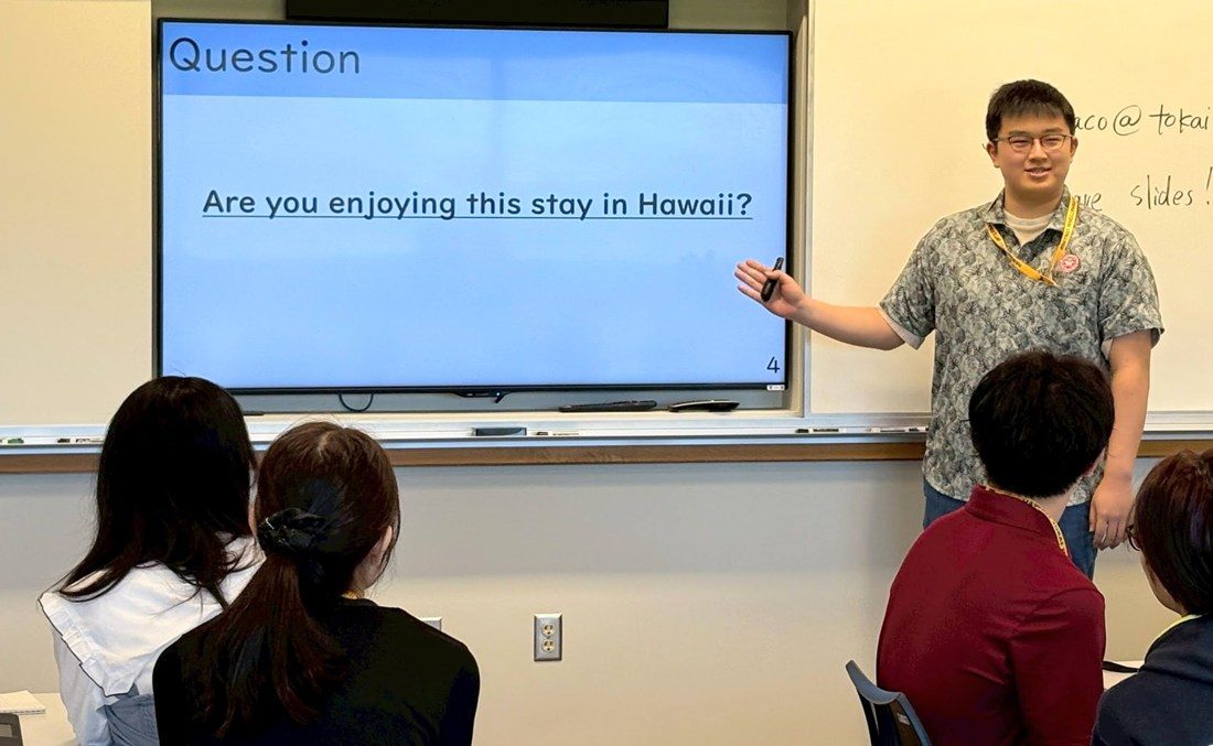 期間中、毎日午前中に実施したHTICの教員による英会話の授業では、グループディスカッションや1分間の即興スピーチで会話力や表現力を高めるとともに、効果的なプレゼンテーションの方法を学修。各自が設定した発表テーマの内容をブラッシュアップしてスピーチの練習を繰り返し、最終日にその成果を披露しました。午後のアクティビティーでは、ハワイ大学ウエストオアフ校のプレ・ナーシングプログラムの授業を見学し、日本語を学ぶ学生と交流。聖ルカクリニックの見学や現地で活動する日本人医師のレクチャーを通じて、ハワイの医学教育や診療活動、医療英語の修得法に関する学びを深めました。