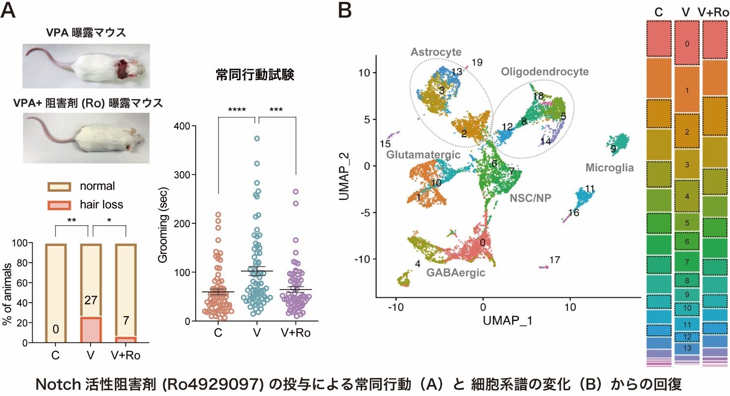 研究グループは、「Notch(ノッチ)シグナル」と呼ばれる細胞間の情報伝達経路に着目し、ヒトiPS細胞などを用いた複数のASDモデルについて、シグナルの変化を網羅的に解析しました。その結果、モデルに共通する病態として、Notchシグナルの過剰活性が大脳皮質の高次機能維持に不可欠な神経細胞「VIP養成抑制性神経細胞」(VIP-INs)の分化を抑制することを発見。さらに、胎生期のASDモデルマウスを使った実験により、Notchシグナルの活性を阻害する薬剤「γ-secretase阻害剤」を投与するとVIP-INsの分化が回復し、社会性行動異常や常同行動が改善することを確認しました。