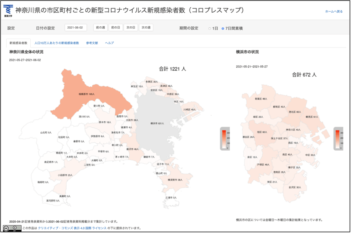 現在公開しているコンテンツは、神奈川県と東京都を対象とした、市区町村単位での新型コロナウイルス新規感染者数のコロプレスマップです(下図)。コロプレスマップとは、統計値により色を塗り分けた地図のことです。これにより、自宅や職場周辺での感染動向を直感的に理解することができます。都道府県単位での集計データでは見えなかった地域差が明らかになり、感染リスクの正確な評価に役立つと期待しています。このほかにも、ツイッターからのニュース抽出などの開発中のコンテンツがあり、これから順次公開していきます。