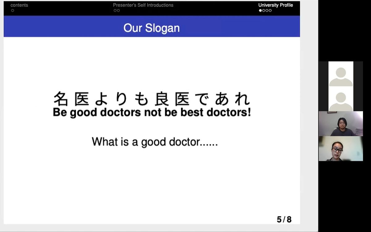 医学部医学科2年次生の菅井優里さんと1年次生の小野村龍さんが、8月5日、6日にオンラインで行われた新潟大学医学部主催の「令和3年度夏期医学生交流プログラム」に参加しました。このプログラムは、同学部がロシアや中国などとの学生交流を推進し、国際舞台で活躍する医師の育成を目的として実施しているものです。海外からは、本学が文部科学省の平成29年度「大学の世界展開力強化事業」の採択を受けて展開している「ライフケア分野におけるブリッジ人材育成―主に極東地域の経済発展を目的として―」事業の連携大学であるモスクワ国立大学をはじめ、中国のハルビン医科大学、スリランカのペラデニア大学の学生らが参加。国内からは新潟大学、筑波大学、金沢大学の学生らが参加し、合計約30名が英語で交流ました。