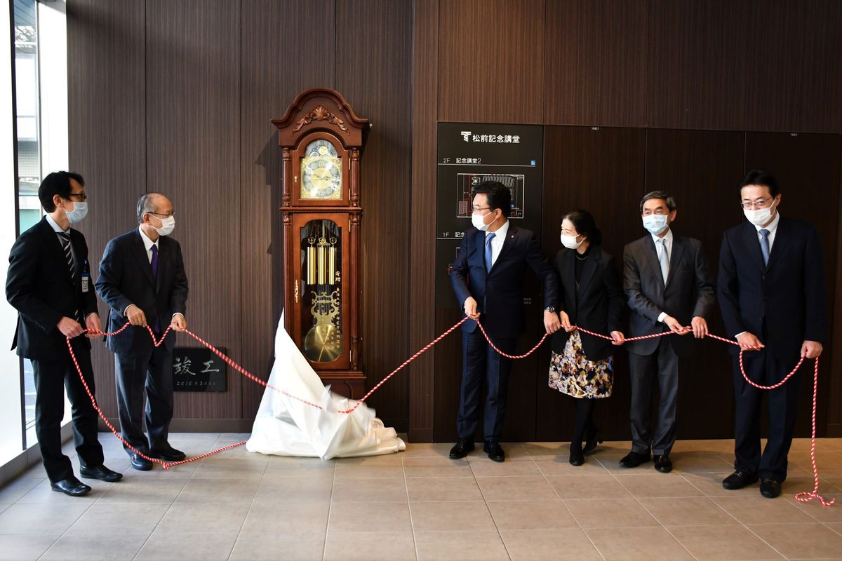 谷口会長から森正樹医学部長への目録の贈呈に続き、谷口会長、白石光一副会長、本多ゆみえ副会長、小川吉明副会長と、森学部長、医学部付属病院の渡辺雅彦病院長がホールクロックにかけられた白布を除幕。時計が姿を現すと会場は大きな拍手に包まれました。