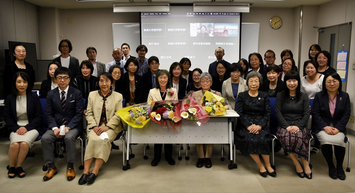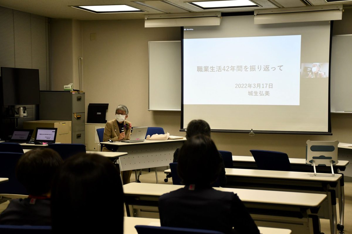 医学部看護学科では3月17日に伊勢原キャンパスで、「2021年度退任教授『最終講義及び懇親会』」を開催。城生弘美教授(医学部副学部長)と金児-石野知子教授が最終講義を行いました。会場では新型コロナウイルス感染症対策を徹底し、森正樹医学部長をはじめ本学部や健康学部、医療技術短期大学の教員、卒業生、医学部付属病院の職員らが出席。オンラインも併用し、約60名が聴講しました。