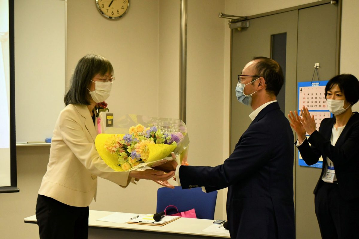 最後に、医療技術短期大学の沓澤智子学長(元・健康科学部長)と、2020年度に退任した横山寛子教授、基礎看護学領域の森屋宏美准教授が両教授との思い出を振り返るとともに感謝の言葉を送り、同領域の教員が看護学科を代表して花束と記念品を贈呈しました。