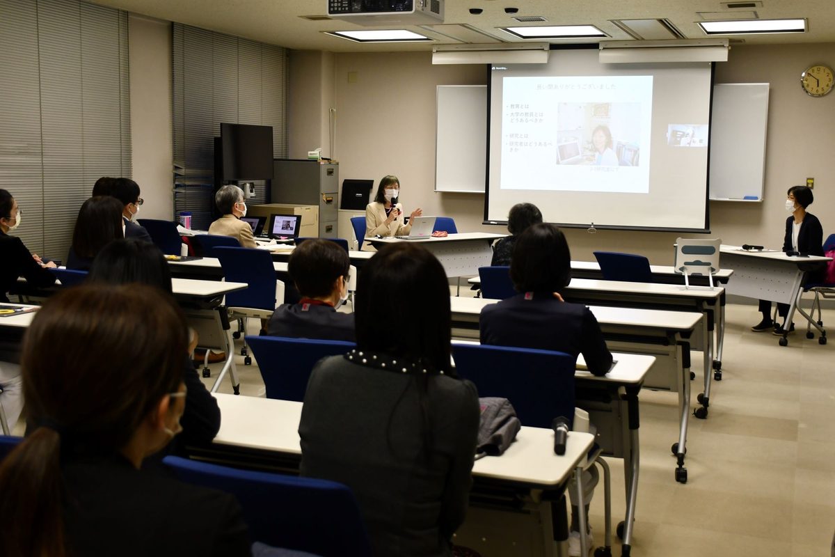 分子生物学や分子発生学が専門の金児-石野教授は、「人体の構造と機能」などの授業を担当する一方で、ウイルス由来の遺伝子の探索とその機能解析に関する研究にも注力した日々を紹介。30年にわたり取り組んできた研究の概要や、ウイルス由来の遺伝子「Peg10」「Peg11」が哺乳類の胎盤形成にかかわることを世界で初めて発表した経緯を説明したほか、若手研究者への思いや今後の研究課題についても語りました。また教育については、遺伝子工学に関する実験のプロトコル動画を自ら作成するなど、高いレベルの実験実習を教授するために工夫を重ねた思い出を振り返り、「教員としては、学生が次のステップに進むためのよき“通過点”であろうと努め、研究者としては、真摯さやデータに対する誠実さを大切にしてきました。自由に研究・教育する環境を与えていただき感謝しています。幸せな27年間でした」と語りました。