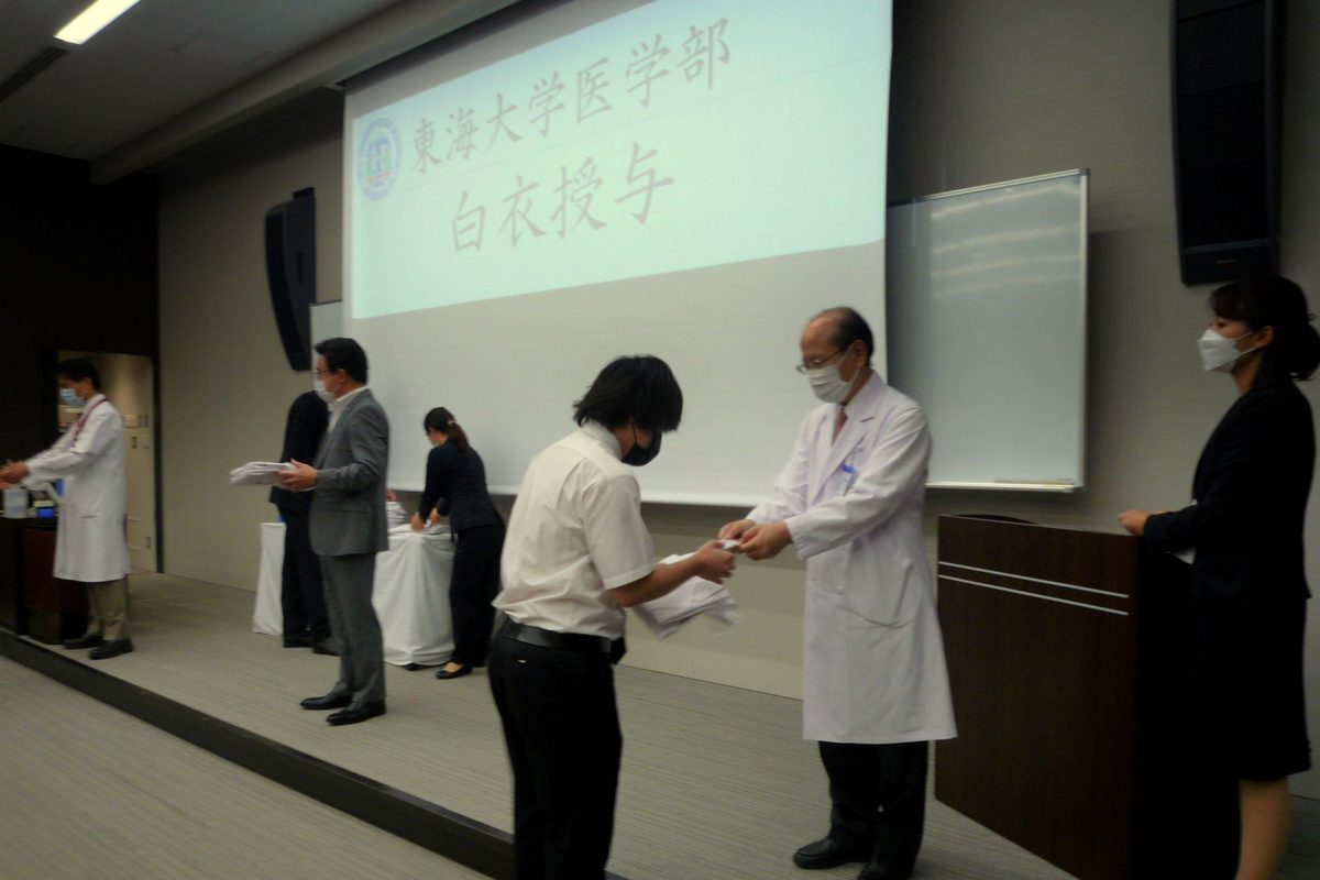 医学部医学科では9月2日に伊勢原校舎で、4年次生を対象とした白衣授与式を行いました。秋学期からスチューデント・ドクター(SD)として医療機関で基礎臨床実習やクリニカルクラークシップ(診療参加型臨床実習)に臨む94名が、プロフェッショナリズムに則した行動や守秘義務の順守を誓約。森正樹医学部長や医学部付属病院の渡辺雅彦病院長、医学科同窓会である星医会の谷口佳浩会長らが激励し、白衣を授与しました。