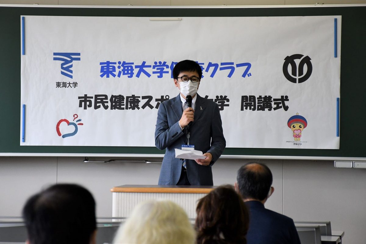 初めに本クラブ会長を務める医学部の吉川隆博副学部長が、「コロナ禍で2年間停止していた活動が、ようやく再開できました。感染対策には十分留意して運営していきます」とあいさつ。来賓として臨席した伊勢原市の髙山松太郎市長は、健康クラブの教員らへの謝辞を述べ、「継続的に楽しくスポーツに取り組んで健康づくりに励むとともに、一人でも多くの人にこの事業を広めてほしいと思います」と受講者を激励しました。続いて、本事業の企画運営に開始当初から携わってきた健康クラブ相談役の谷口幸一先生(元東海大学教授)が、クラブ設立の趣旨やスポーツ大学開講の経緯を紹介。最後に、同じく相談役の吉川政夫先生(同)が、伊勢原市と協同で作成した冊子「いつまでも生き生きと 身体活動量や運動量を増やして健やかな毎日を送ろう」を基に、運動習慣の重要性について説明しました。