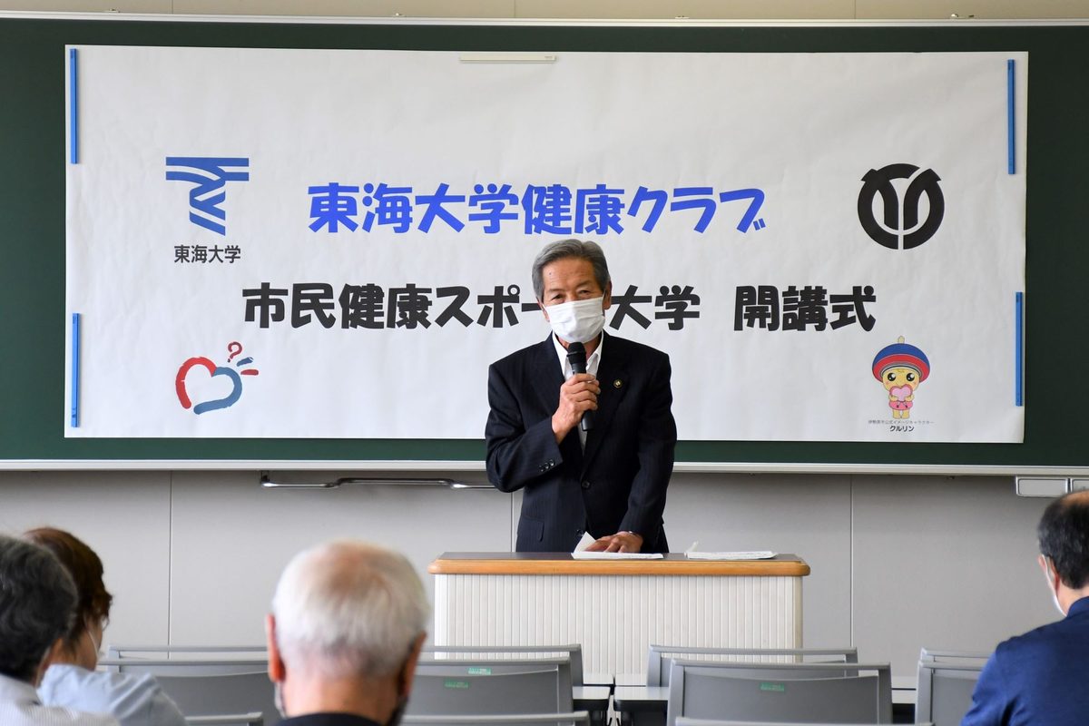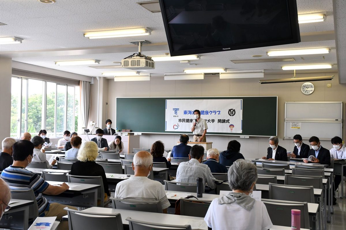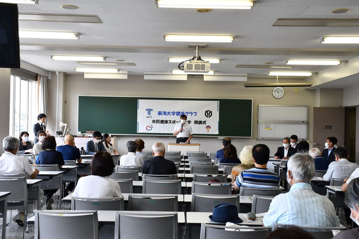 伊勢原校舎で9月17日に、「令和4年度東海大学健康クラブ 市民健康スポーツ大学」の開講式を行いました。この講座は東海大学と伊勢原市との提携事業として、市民の健康づくりや体力の向上を目指して2009年度に開始したものです。医学部と体育学部、健康学部の教員らで構成する「東海大学健康クラブ」のメンバーが講師を務め、心身の健康に関する講義や筋力トレーニング、体力づくりのためのエクササイズを実施します。20年度と21年度は新型コロナウイルス感染症の影響により中止しましたが、昨今の状況を踏まえて3年ぶりに再開。40代から80代の30名以上が入会しました。