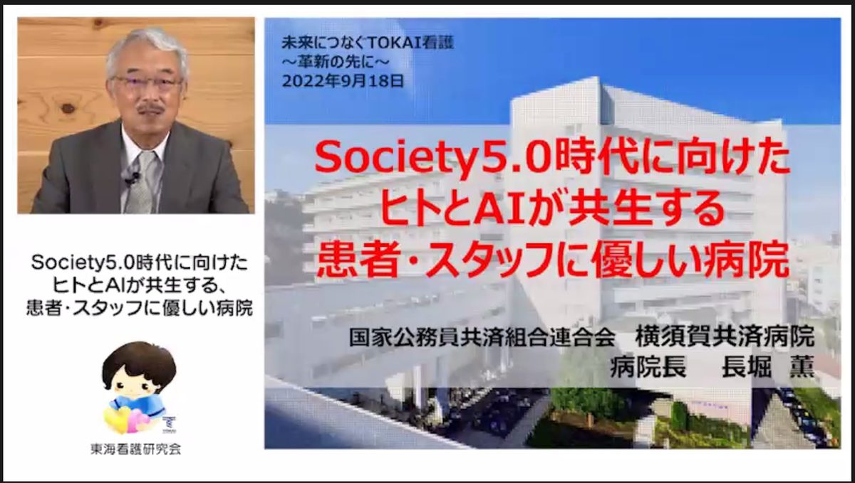 前半は、会員6名が研究発表、2名が実践報告を行い、活発な質疑応答や意見交換を展開しました。後半は、横須賀共済病院長の長堀薫氏が、「Society5.0時代に向けたヒトとAIが共生する、患者・スタッフに優しい病院」と題して基調講演。医療従事者の過重労働の削減と患者満足度の向上を目指して取り組んだ、独自の「AIプロジェクト」の実践事例や成果について説明し、「AIを活用したシステム構築に当たっては、現場のニーズを的確に開発者に伝えることが大切。情報技術を活用し、スタッフがより気持ちよく診療できる環境を整えたい」と語りました。