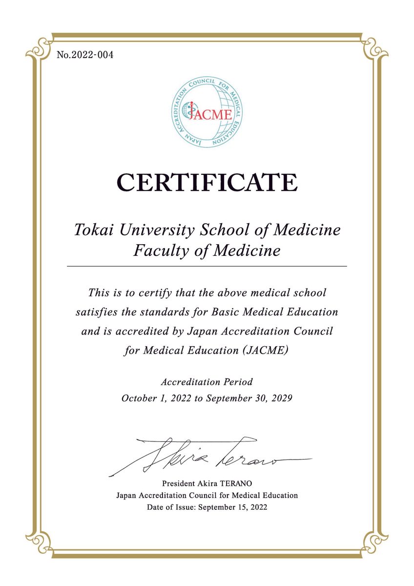 東海大学医学部医学科では、2021年10月に日本医学教育評価機構(JACME)による医学教育分野別評価を受審した結果、2022年9月15日付で評価基準に適合していると認定されました。(認定期間:2022年10月1日~2029年9月30日)