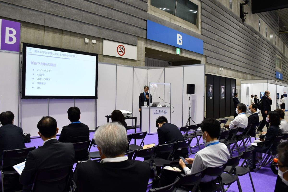 初日には、医学部医学科基礎医学系分子生命科学の秦野伸二教授(メディカルサイエンスカレッジ 伊勢原研究推進部長)が、「東海大学における医理工連携による新規疾患治療法開発の取り組み」をテーマにプレゼンテーションしました。秦野教授は、診療科にとらわれず自由な発想で研究できる医学部の研究体制や、医理工のみならず、生物学部や海洋学部、農学部、学内研究機関などとも連携し、大学のスケールメリットを生かした学際的な研究が進められていることを紹介。その具体例として、今回ポスター発表している研究の概要について説明しました。さらに、学部の枠を超えた研究サポート施設として、実験・研究機器のメンテナンスから運用までを専任の技術職員がサポートする伊勢原校舎の生命科学統合支援センターについても紹介。最後に、本学における医学研究強化のキーワードとして、「バイオバンク」「AI医学」「スポーツ医学」「災害医学」を挙げ、「産官学連携により研究開発力をさらに強化するとともに、医学部付属病院が位置する神奈川県西部地域の医療の重点的サポートにも貢献したい」と語りました。