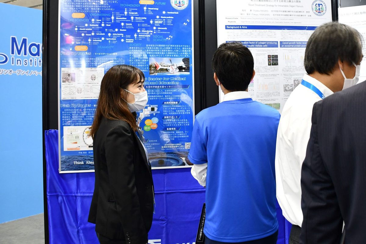 ポスター発表のブースでは、医学部医学科の稲垣豊教授(基盤診療学系先端医療科学)が「難治性臓器線維症に対する新規治療法の開発」、同・中川草准教授(基礎医学系分子生命科学)が「大規模塩基配列を活用したウイルスゲノム解析」をテーマに発表。また、マイクロ・ナノ研究開発センターの木村啓志教授(工学部生物工学科兼務)は、「創薬・再生医療における生体模倣システム(MPS)の実用化検討」と題して発表しました。ブースには、連日、多くの大学や企業の研究者らが訪れ、研究の詳細や臨床応用の可能性などについて意見を交わしていました。