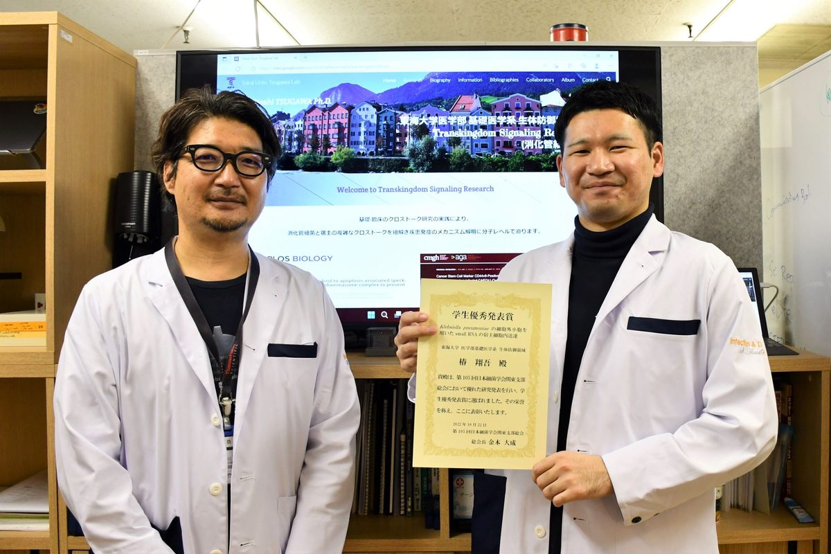 医学部医学科3年次生の椿翔吾さんが、10月22日にオンラインで開催された第105回日本細菌学会関東支部総会で「Klebsiella pneumoniaeの細胞外小胞を用いたsmall RNAの宿主細胞内送達」をテーマに研究成果を発表し、「学生優秀発表賞」を受賞しました。