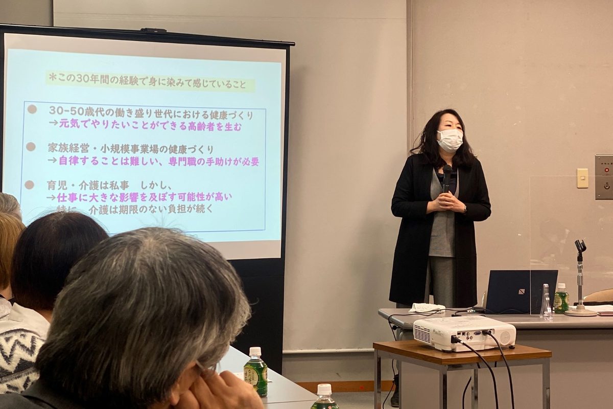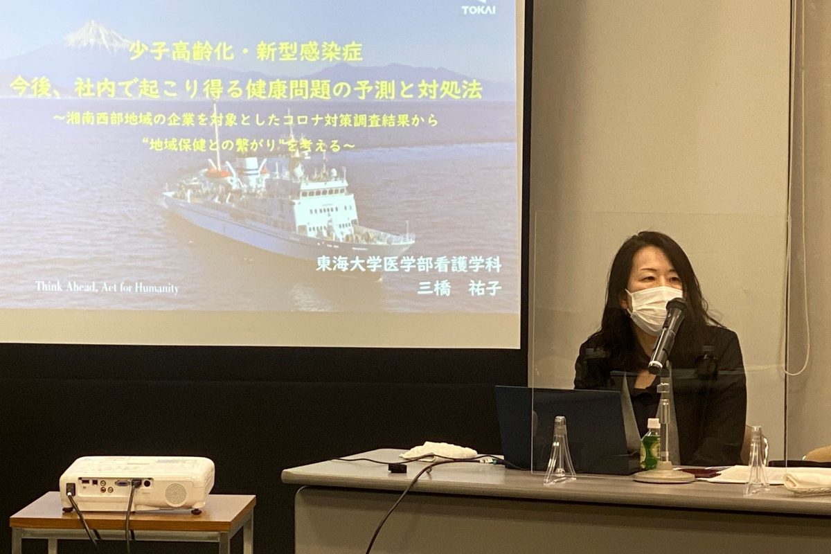 医学部看護学科の三橋祐子准教授が1月27日に、秦野商工会議所で開催された「企業における健康管理セミナー」で講演しました。このセミナーは、企業で働く人々を取り巻く多様な課題にどのように取り組むべきかを考えようと、同会議所が開いたものです。産業看護学と公衆衛生看護学が専門の三橋准教授は、「少子高齢化・新型感染症……今後、社内で起こり得る健康問題の予測と対処法~湘南西部地域の企業を対象としたコロナ対策調査結果から“地域保健との繋がり”を考える~」をテーマに講演しました。