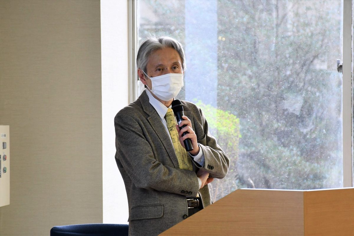 今年度で退職する安藤所長は、42年にわたる本研究所の歴史をたどりながら、医学部の特徴的な研究の一つであり、自身も携わってきた疾患モデル動物を使った研究を紹介。がんの増殖を促進する「ヒトH-ras遺伝子」を挿入した遺伝子改変マウスによる化学発がん研究や、アメリカ・ハーバード大学医学部ダナ・ファーバーがん研究所における細胞周期に関する研究、体外増幅させたヒト造血幹細胞の移植治療、血液疾患モデル動物の作製、第Ⅲ相臨床試験に進んでいる本研究所発の画期的な慢性骨髄性白血病治療薬「PAI-1阻害剤」の成果について説明しました。最後に、今後の医学研究や若手研究者の育成に関する参加者からの質問に答え、「研究を続けるエネルギーの源となるのは好奇心です。研究環境は変化しており、ビッグデータやAIの活用など研究方法も大きく変わりつつありますが、常に志を保ち、柔軟な発想を持ってそうした変化に適応し、医学研究をさらに進展させてほしい」と語りました。