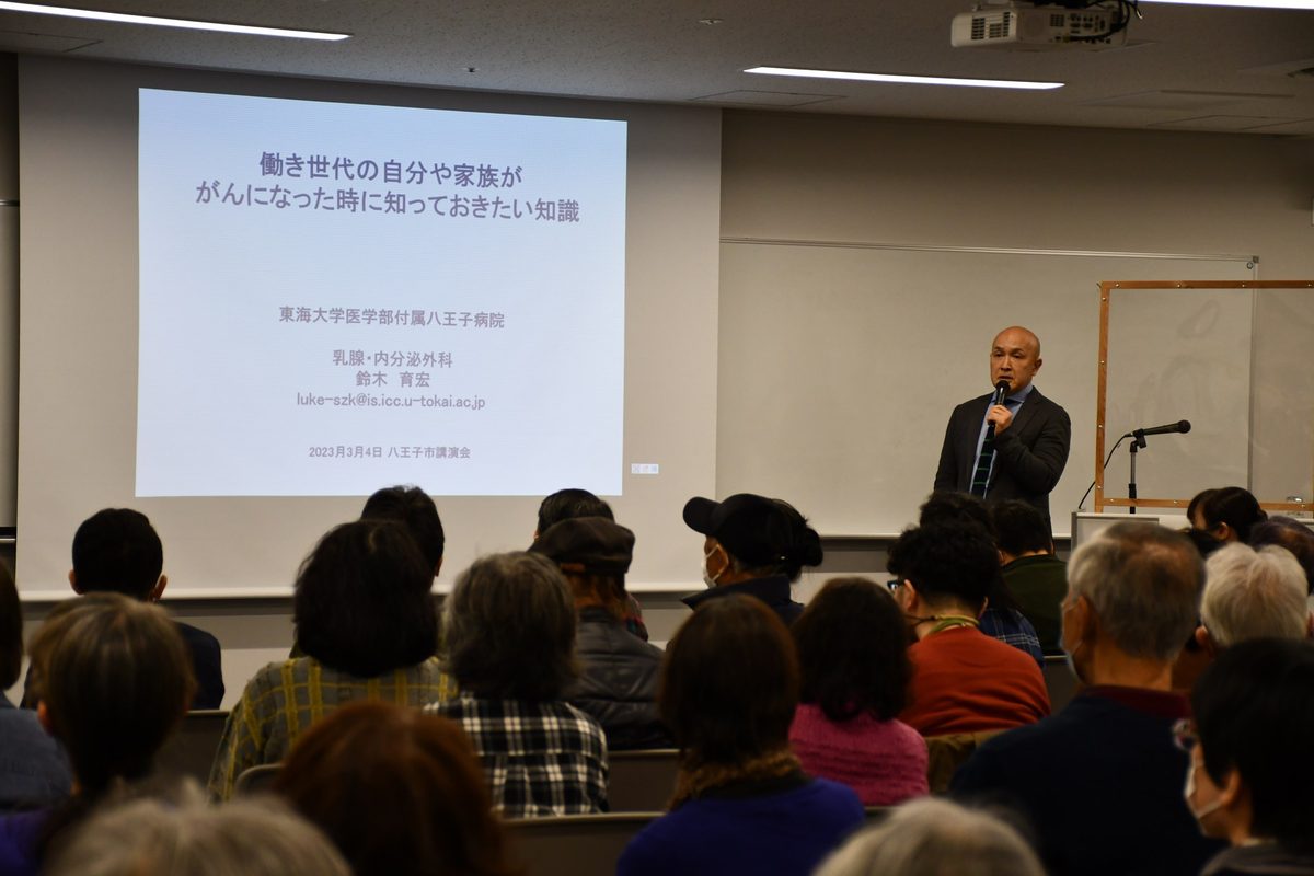 医学部付属八王子病院が3月4日に八王子市保健所で、「働き世代の自分や家族が、がんになったときに知っておきたい知識」をテーマに、がん患者支援セミナーを開催しました。がんの当事者や家族をはじめ、多くの市民にがんに関する知識や患者支援制度について理解を深めてもらうため、地域の中核病院である本病院と東京医科大学八王子医療センター、八王子市の3者が初めて共催したものです。今回は、厚生労働省が定めた「女性の健康週間」(3月1日から8日)に合わせ、付属八王子病院の鈴木育宏副院長(医学部医学科外科学系乳腺・腫瘍科学教授)が講演。両病院に設置されている「がん相談支援センター」のスタッフによる個別相談会も行い、約160名が参加しました。