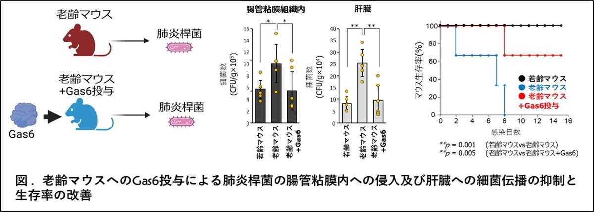 津川講師らは、肺炎桿菌を経口感染させた若齢マウスと老齢マウスの比較実験により、肺炎桿菌は老齢マウスのほうが腸管粘膜内に侵入しやすく、その要因が腸管粘膜に常在するマクロファージ(免疫細胞)の相対的存在量の加齢に伴う顕著な減少にあることを発見。加齢に伴い減少してしまうこのマクロファージは肺炎桿菌を認識すると「Gas6」と呼ばれるタンパク質を分泌し、分泌されたGas6が腸管粘膜上皮細胞の受容体「Axl」に結合すると、これを合図に上皮細胞間接着が強まり、腸管粘膜のバリア機能が高まって肺炎桿菌の腸管粘膜内への侵入を抑制していることを突き止めました。