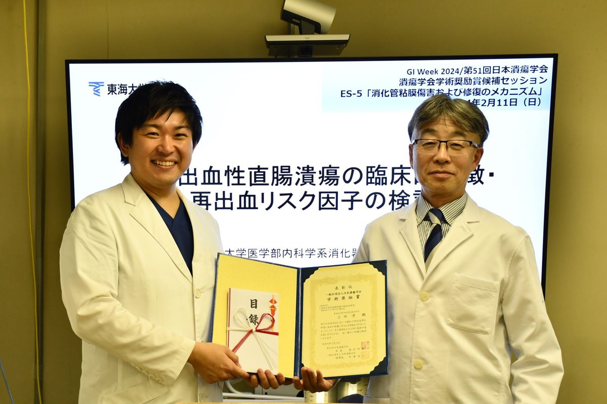 医学部付属病院消化器内科の上田孝医師(大学院医学研究科先端医科学専攻=博士課程・4年次生)が、2月10、11日に沖縄県宜野湾市で開催された第51回日本潰瘍学会(GI Week 2024)で、「急性出血性直腸潰瘍の臨床的特徴・再出血リスク因子の検討」をテーマに研究成果を発表。優秀な学術報告をした研究者に贈られる「学術奨励賞」を受賞しました。