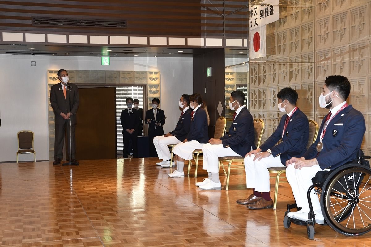 授賞式では、阿部知事から、「東京五輪・パラリンピックだけでなく、これまで積み上げられた努力に敬意を表します。皆さんの活躍は、県民に多くの感動を与えてくれました。今大会で目標を達成できた方も悔しい思いをした方もいると思います。ぜひこの経験を今後に生かし、さらなるご活躍を期待しています」とエールが送られ、県関係者らから大きな拍手を受けました。