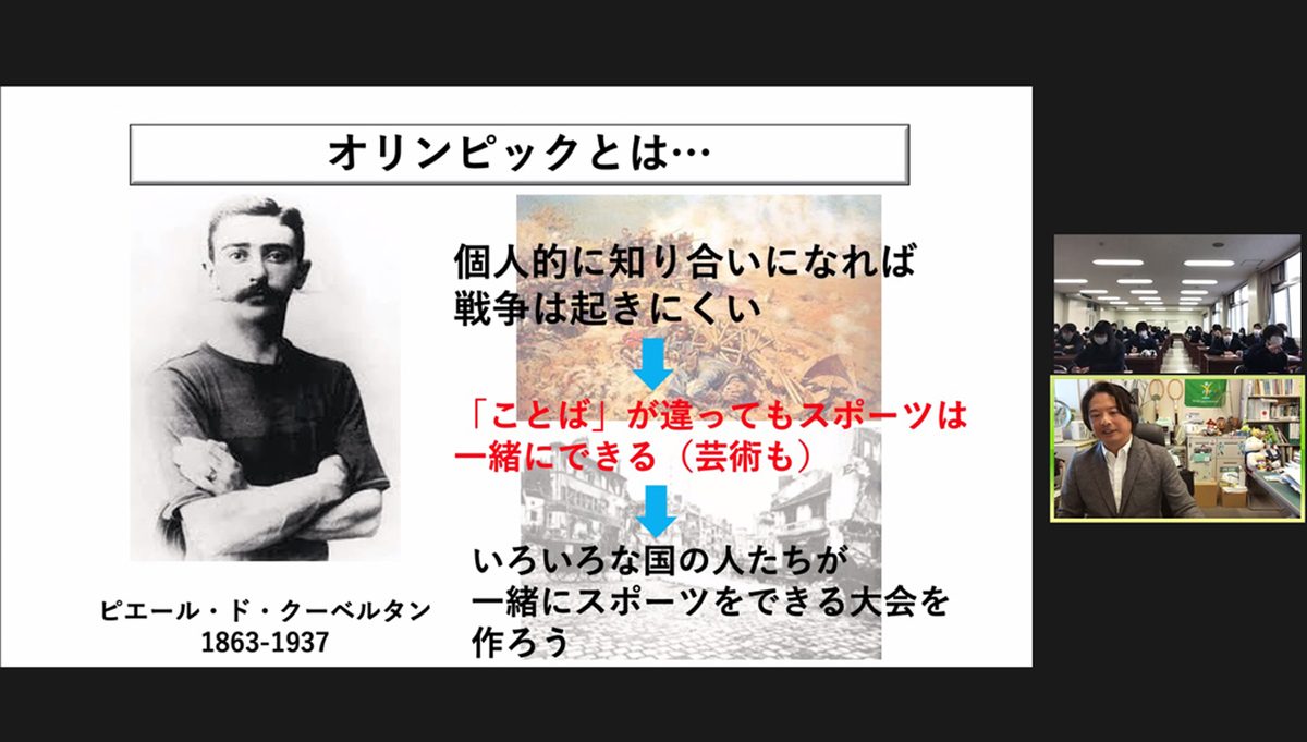 体育学部スポーツ・レジャーマネジメント学科の大津克哉准教授が2月22日に、付属甲府高校の「東海大学特別講座」で講師を務めました。この講座は、同校の特進コースBに通う1年生40名が東海大の教員による授業を受け、3年間で幅広い視野や考え方などを培うことを目的としています。今回は新型コロナウイルス感染症拡大の影響により、オンラインで実施しました。