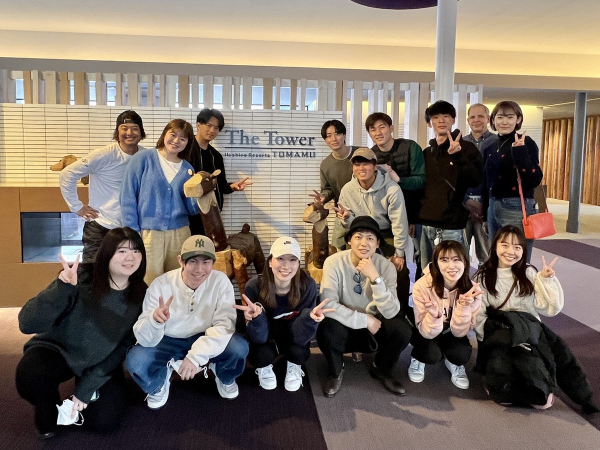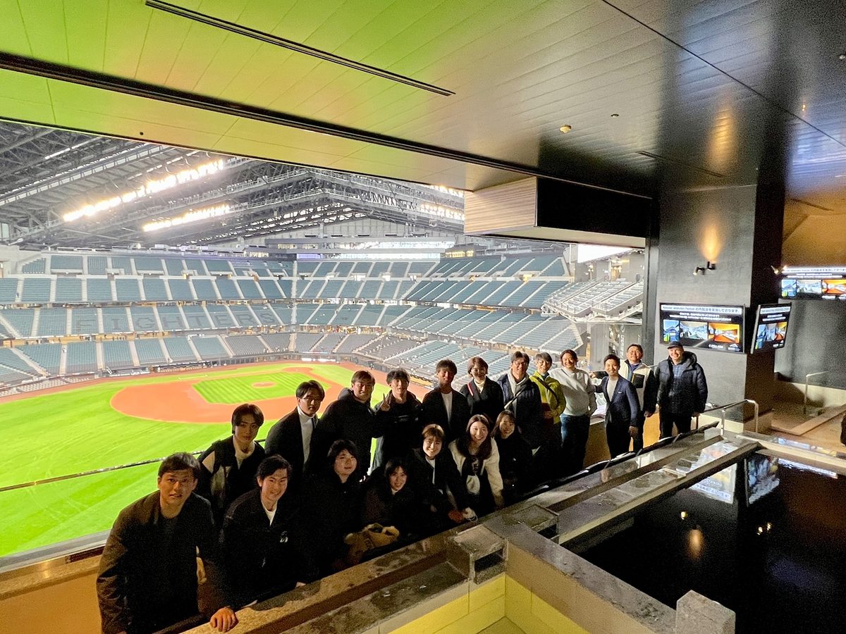 今回のフィールドワークには、13名の学生が参加しました。学生たちはまず、Bリーグのプロバスケットボールチーム「レバンガ北海道」協力のもと、札幌市にあるホームスタジアムの北海道立総合体育センター(通称:北海きたえーる)を訪問。チームの代表取締役CEOを務める横田陽氏による特別講義やバックヤードツアーに参加したほか、同チームで働く本学卒業生らとも交流を深めました。茨城ロボッツとのリーグ戦も観戦し、試合後には、男子バスケットボール部卒業生の島谷怜選手(体育学部2022年度卒)の案内で、ロッカールームで集合写真を撮影しました。翌日からは、占冠村にあるリゾートホテル「星野リゾート トマム ザ・タワー」に足を運び、SDGsへの取り組みやインバウンド観光のほか、同リゾートが展開する農業プロジェクトなど独自のホスピタリティ事業について学びました。さらに学生たちは、プロ野球・北海道日本ハムファイターズの本拠地として北広島市に今年竣工した「エスコンフィールドHOKKAIDO」がある「北海道ボールパークFビレッジ」を見学。球場見学だけでなく、宿泊施設を完備したレジャー施設「TOWER 11」の運営に携わる株式会社SQUEEZE代表取締役の舘林真一社長(政治経済学部12年度卒)にも大学時代の経験や現在の業務に関するインタビューを行いました。