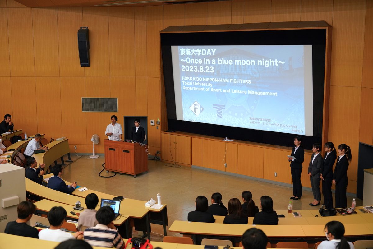 体育学部スポーツ・レジャーマネジメント学科では6月14日と28日に湘南キャンパスで、特別講義を行いました。本学では8月23日(水)にES CON FIELD HOKKAIDOで行われるプロ野球公式戦・北海道日本ハムファイターズ対東北楽天ゴールデンイーグルスの試合を「東海大学DAY~Once in a blue moon night~」と題して行い、本学科生が試合の前後にさまざまなイベントを企画しています。札幌キャンパス国際文化学部地域創造学科の学生たちは、視覚に障がいがあってもスポーツ観戦の楽しさを体感できるプログラムを計画中です。今回の講義は、東海大学DAYに向けて試合運営の裏側などを知ってもらおうと企画したもの。両日ともにエスコンフィールドHOKKAIDOを保有・運営する株式会社ファイターズスポーツ&エンターテイメントから講師を招き、札幌キャンパスともオンラインでつないで実施しました。