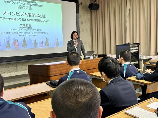 体育学部スポーツ・レジャーマネジメント学科の大津克哉准教授が、3月8日に付属甲府高校の「東海大学特別講座」で講師を務めました。この講座は、同校の特進バランスコースに通う1年生40名が本学の教員による授業を受け、3年間で幅広い視野や考え方などを培うことを目的としています。