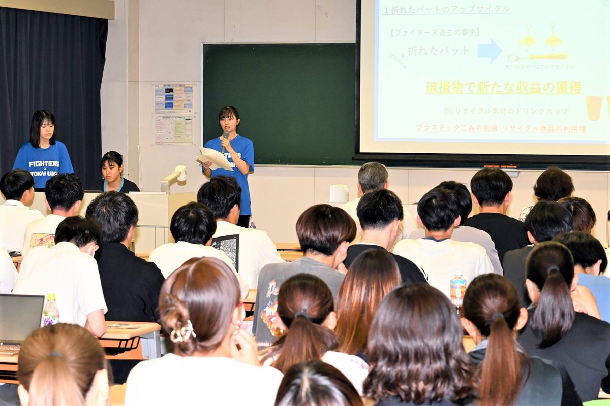 その後は本学科生が東海大学DAY当日に企画している内容について発表しました。まず昨年実習に参加した学生有志が、環境保全活動として不要になったユニホームを使ったエコバック作成ワークショップや、折れたバットをリサイクル素材のドリンクカップに作り替えるといった案を紹介。「スポーツイベントマネジメント実習」の履修学生は4つの班に分かれ、試合当日に上映する映像の制作やベースランニング企画、始球式のゲストの選定、5回終了時に行われる「YMCA」ダンスへの参加について説明し、「スポーツ&レジャーインターンシップ・ボランティア」の履修学生は東海大学のオリジナル商品が当たるクイズ企画や抽選企画について提案しました。また、札幌キャンパス国際文化学部地域創造学科の植田俊准教授は、視覚に障がいがあってもスポーツ観戦の楽しさを体感できるプログラムについて説明しました。全体統括を務める瘧師椋奈さん(スポーツ・レジャーマネジメント学科2年次生)は、「2回目の開催となる今回は、昨年度とは違った私たちの色を出し、より多くの人に東海大学のよさを感じてもらえる1日にしたい」と意気込みを語りました。