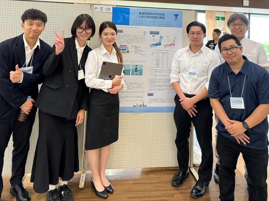 中国から本学に留学している楼さんは今回、「都道府県別の平均歩数と歩行環境指標の関連」をテーマに、日常における歩数の増加が生活習慣病予防や高齢者の自立度維持に寄与するとして、男女別に相互の関連を分析。都市化が進む地域では平均歩数が増加傾向にあることや、男女間で異なる環境整備の必要性などをまとめて発表しました。楼さんは、「研究の信頼性を高めるために、データの選定と収集には厚生労働省と総務省のデータを使用しました。また、歩行環境評価手法として広く使用されているANEWS(Abbreviated Neighborhood Environment Walk-ability Scale)を参考に14項目の歩行環境指標を選定するなど、先行研究との比較を通じて最新の状況を反映しています」と解説。自身初となるポスター発表を振り返り、「参加された多くの研究者から興味を持っていただき、分析に使用するデータの内容や地方の歩行環境の改善策に向けたアイデアなど意見交換の機会もありました。自分の研究の不足点を見直すことができたので、今後の研究につなげていきたい」と話しました。