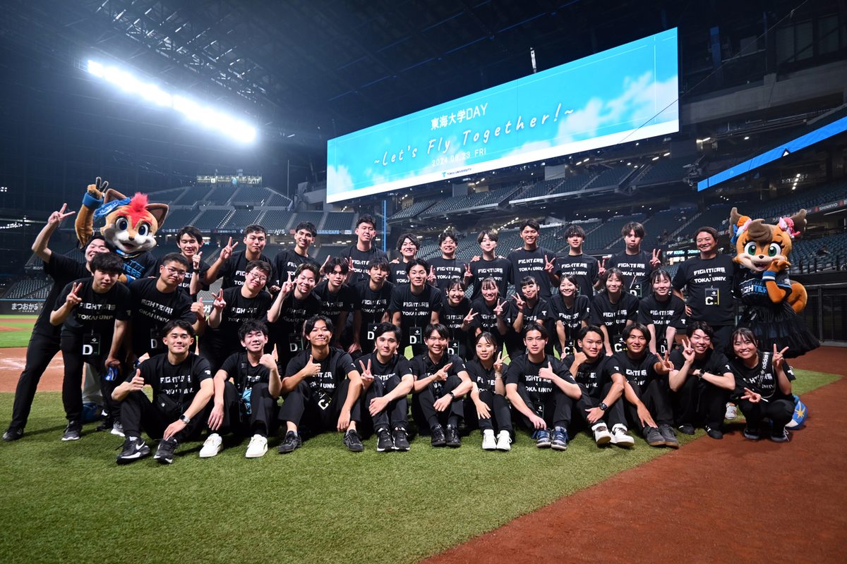 東海大学では8月23日に、北海道北広島市・エスコンフィールドHOKKAIDOで行われたプロ野球公式戦・北海道日本ハムファイターズ対福岡ソフトバンクホークスの試合を「東海大学DAY~Let’s Fly Together!~」としてサポートしました。ファイターズの事業運営会社である株式会社ファイターズスポーツ&エンターテイメントの協力を得て昨年度に続いて実施したもので、学生や教職員がイベントの企画・運営を担当しました。