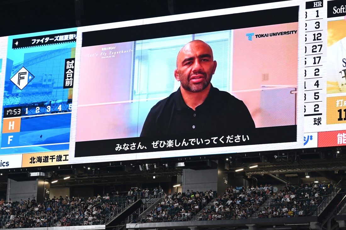 東海大学では8月23日に、北海道北広島市・エスコンフィールドHOKKAIDOで行われたプロ野球公式戦・北海道日本ハムファイターズ対福岡ソフトバンクホークスの試合を「東海大学DAY~Let’s Fly Together!~」としてサポートしました。ファイターズの事業運営会社である株式会社ファイターズスポーツ&エンターテイメントの協力を得て昨年度に続いて実施したもので、学生や教職員がイベントの企画・運営を担当しました。