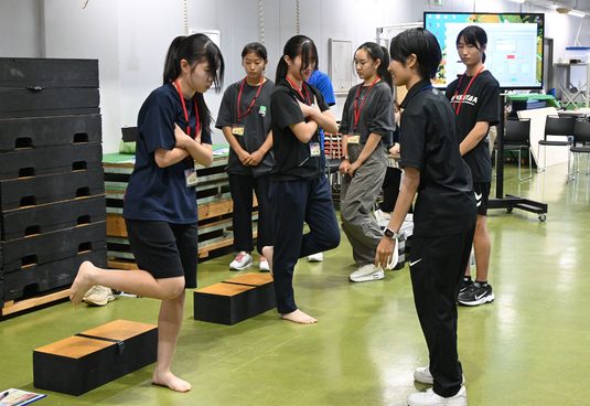 途中のブレイクタイムには強化指定クラブの選手たちが使用するトレー二ングセンターや、高地トレーニングを再現できる低酸素室といったトータルコンディショニング施設を見学。その後、コンディショニング室で笹木准教授の指導を受け、2人一組となって足関節にテーピングを巻き合いました。再びバイオメカニクス実験室でテーピングを施した足で台から飛び降りて身体に加わる衝撃負荷を測定。衝撃緩衝指数を割り出し、裸足とテーピングを巻いた後とのデータとを模造紙のグラフにプロットし、比較検討しました。