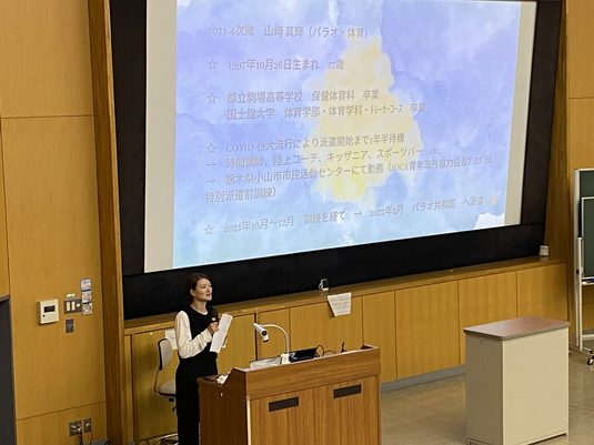 当日は、松浪教授が本セミナーの開催趣旨を説明し、青年海外協力協会の原浩治氏が発展途上国での活動内容や応募資格、待遇、参加するための金銭的な負担がないことなど、事業概要を紹介しました。続いて、2022年から2年間にわたってパラオ共和国の保健省公衆衛生局生活習慣病対策ユニットに配属され、運動療法を通した人々の健康増進活動に取り組んだ山﨑真輝氏(職種:体育)が登壇。パラオでの生活や、実際の活動、活動する上で感じた文化の違いなどを講演しました。来年1月からパラオに移住する予定で、JICA海外協力隊の活動の経験をふまえた海外で生活を始める意気込みについても語りました。