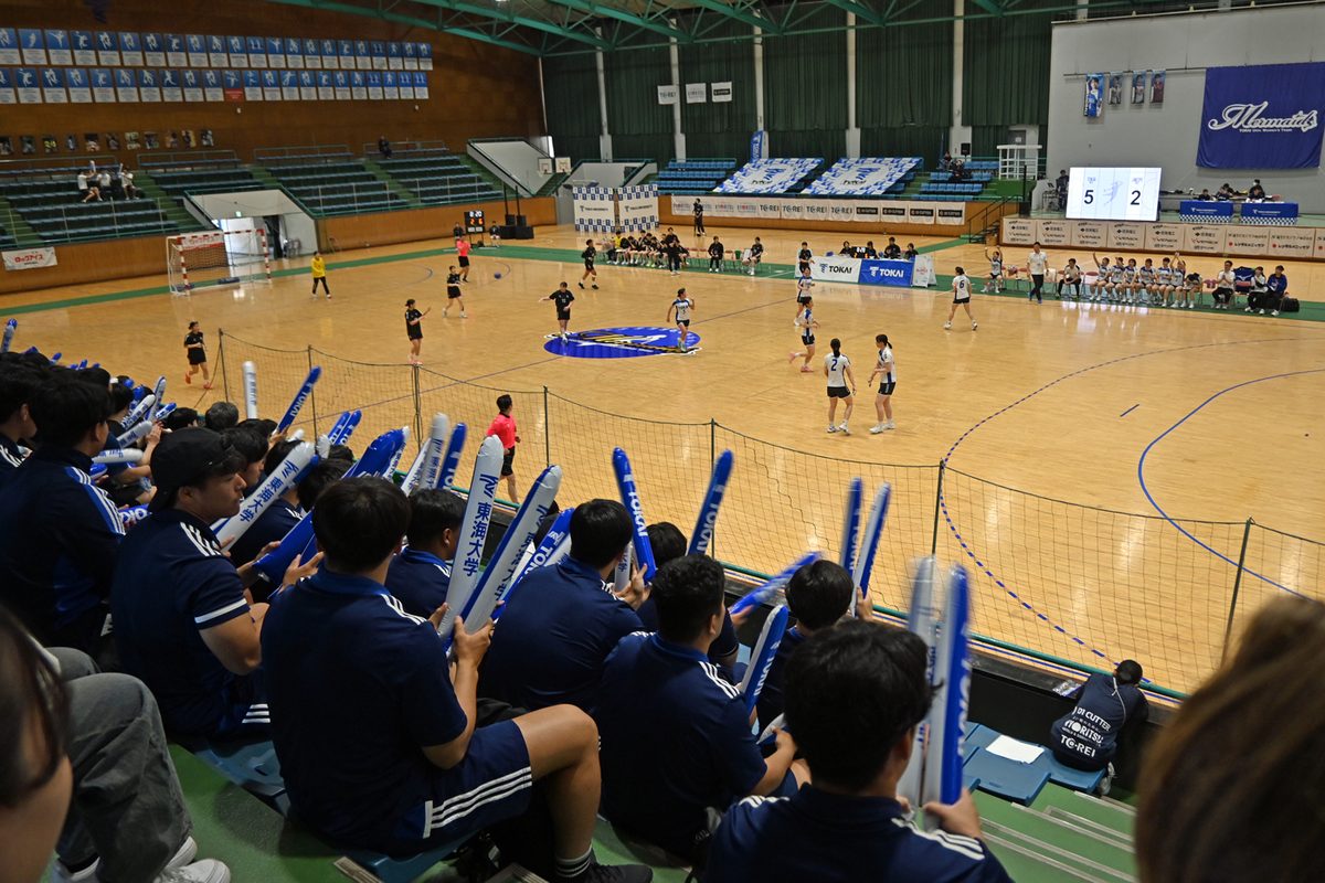 MCを担当した瘧師さんは、「目の前で起きていることを、どのように伝えたら会場を盛り上げられるかを考えながら取り組みました」とコメント。前島さんは、「1年時からハンドボールの試合運営に携わっていたので、これまでの経験を生かして準備してきました。ハンドボールでは選手オーダーが試合直前に届くので、試合前に電光掲示板に流すチームや審判の紹介スライドやアナウンス原稿を編集し、臨機応変に対応できました」と話していました。