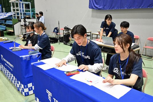 体育学部スポーツ・レジャーマネジメント学科の学生が4月19、20日に、湘南キャンパスの総合体育館で開催された「2025年度関東学生ハンドボール連盟春季リーグ戦」第1、2試合を女子ハンドボール部のホームゲームとして運営しました。同学科では、学生たちに試合運営を通してスポーツの魅力を伝え、裏方として試合を盛り上げながら将来につながる経験を培ってもらおうと、男子バスケットボール部が出場する「関東大学リーグ戦」や、女子ハンドボール部のリーグ戦をホームゲームとして運営しています。今回は、有志学生約20名が参加しました。