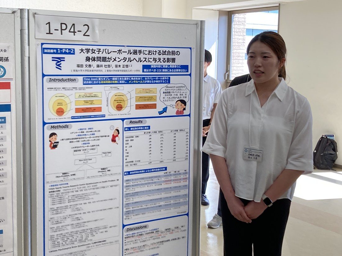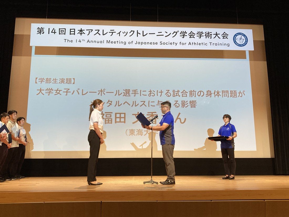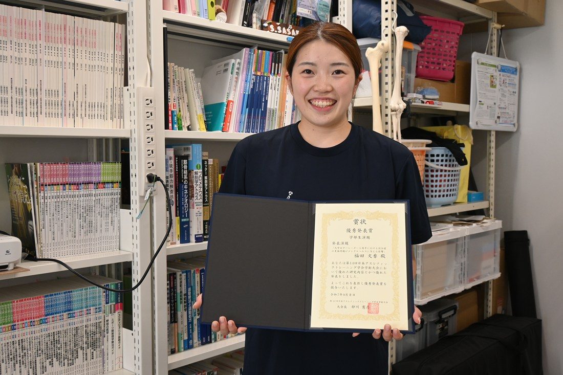 大学院体育学研究科(博士課程前期)の福田文香さんが9月6、7日に、帝京平成大学中野キャンパスで開催された第14回日本アスレティックトレーニング学会学術大会で「優秀発表賞」を受賞しました。同学会は、アスレティックトレーナーが関わるあらゆる領域の科学的研究とその発展、アスレティックトレーニング学の普及・発展に寄与することを目指して設立されたものです。
