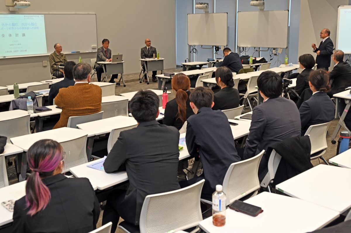初めに武田教授が主旨を説明し、「体育・スポーツ領域は自然科学と人文・社会科学が併存する複合領域ですが、互いの前提や方法論を十分に共有しないまま議論が進められる場面が少なくありません。本シンポジウムではこの課題意識の下、『身体』をキーワードに、自然科学的に『外から捉え』、人文・臨床的な立場からは『内から捉える』両方の視点から議論したいと考えました」と語りました。続いての話題提供ではまず久保名誉教授が、「教育哲学から身体を捉える視点」として講演し、本学退職後、スポーツ&レジャー研究所を立ち上げて取り組んできた身体教育に関する多様な研究について紹介。主体としての身体として「生きられた身体」の重要性を哲学的観点から論じました。山田所長は、「身体を“外から掴む”バイオメカニクス」をテーマに、スポーツ・バイオメカニクスを巡る近隣領域とアプローチの違い、バイオメカニクスによる外部観察手法の有効性を示しつつ、内部からの視点の重要性や両者の融合の可能性について言及しました。武田教授は、「身体:内から掴む 心理サポート実践で語られる生きられた身体」と題して、自らがトップレベルのアスリートを対象に行ってきた、臨床スポーツ心理学に基づいた実践の具体例を示し、アスリートが自分の身体感覚を発見していく詳細な過程と、外部からの指示に依存していた状態から自身の身体との対話を通じて主体性を回復していく様子について報告しました。会場も交えた全体討議では、学生教育への応用や最新技術を用いた研究のあり方、異分野間での共同研究の重要性など多岐にわたるテーマで登壇者らが熱心に意見を交わしました。