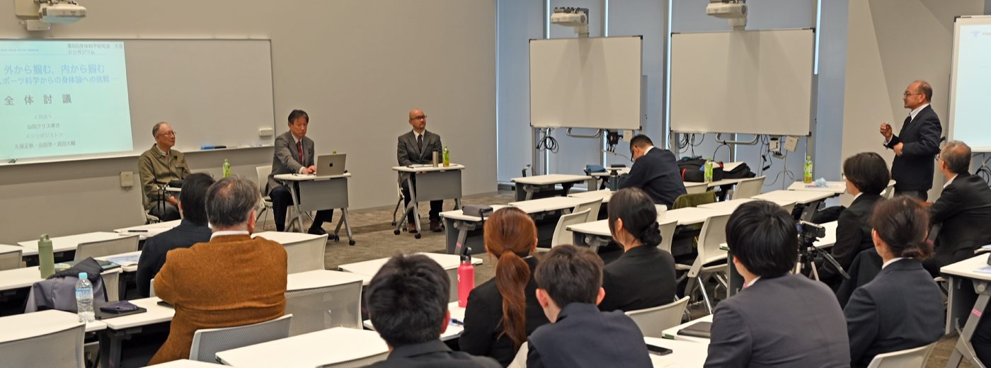 初めに武田教授が主旨を説明し、「体育・スポーツ領域は自然科学と人文・社会科学が併存する複合領域ですが、互いの前提や方法論を十分に共有しないまま議論が進められる場面が少なくありません。本シンポジウムではこの課題意識の下、『身体』をキーワードに、自然科学的に『外から捉え』、人文・臨床的な立場からは『内から捉える』両方の視点から議論したいと考えました」と語りました。続いての話題提供ではまず久保名誉教授が、「教育哲学から身体を捉える視点」として講演し、本学退職後、スポーツ&レジャー研究所を立ち上げて取り組んできた身体教育に関する多様な研究について紹介。主体としての身体として「生きられた身体」の重要性を哲学的観点から論じました。山田所長は、「身体を“外から掴む”バイオメカニクス」をテーマに、スポーツ・バイオメカニクスを巡る近隣領域とアプローチの違い、バイオメカニクスによる外部観察手法の有効性を示しつつ、内部からの視点の重要性や両者の融合の可能性について言及しました。武田教授は、「身体:内から掴む 心理サポート実践で語られる生きられた身体」と題して、自らがトップレベルのアスリートを対象に行ってきた、臨床スポーツ心理学に基づいた実践の具体例を示し、アスリートが自分の身体感覚を発見していく詳細な過程と、外部からの指示に依存していた状態から自身の身体との対話を通じて主体性を回復していく様子について報告しました。会場も交えた全体討議では、学生教育への応用や最新技術を用いた研究のあり方、異分野間での共同研究の重要性など多岐にわたるテーマで登壇者らが熱心に意見を交わしました。