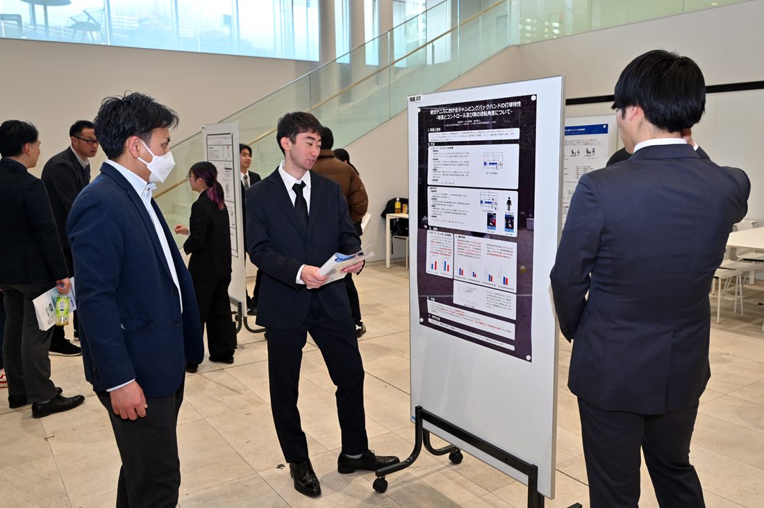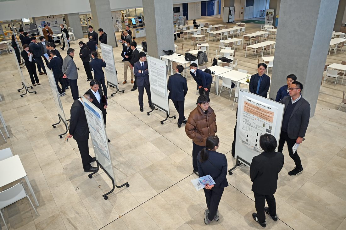 当日は、初めに19号館カフェラウンジでポスター発表を実施。本学体育学部、大学院体育学研究科、スポーツ医科学研究所の教員、大学院生、学部生から16件の発表があり、フラッシュトークとして代表者が参加者に向けて研究の背景や概要、成果を語り、各ポスターの前では発表者と参加者が活発にディスカッションしました。続いて場所をオープンマルチアトリエに移し、シンポジウム「身体:外から掴む、内から掴む―体育・スポーツ科学からの身体論への挑戦―」を実施。スポーツ医科学研究所の山田クリス孝介准教授が司会を務め、久保正秋本学名誉教授とスポーツ医科学研究所の山田洋所長、本シンポジウム企画者の武田大輔教授(体育学部)が登壇しました。